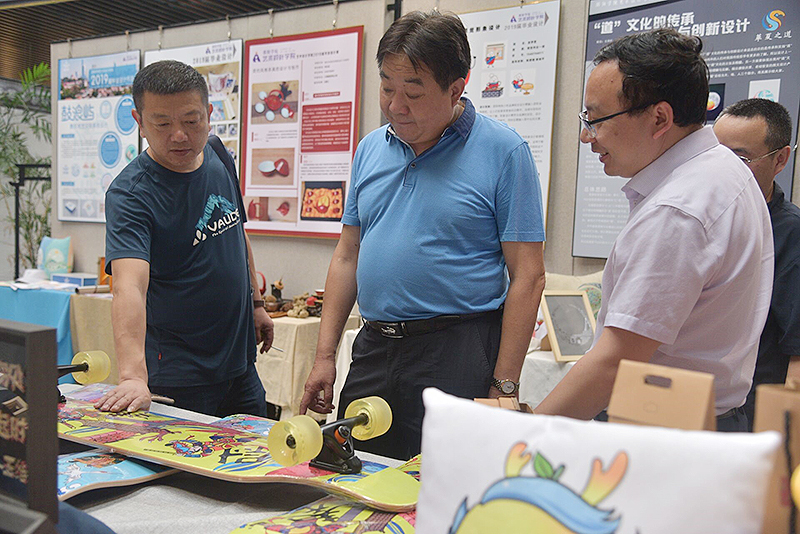 赵应国部长细致地观看了学生们每一件设计作品,他高度评价了本次展览作品展示的美术功底和设计能力。他认为,本次高质量的毕业展,是邵阳学院办学实力的体现,是艺术设计学院立足地方培养人才理念的展示,特别是众多作品能借鉴邵阳的非遗文化元素,围绕邵阳地方产业资源的开发与创新进行设计,是学生对自己社会责任和担当的思考。他希望校地、校企能进一步深度融合,将代表邵阳特色的产品全面推向市场,为邵阳的经济发展和地域文化的传承助力。