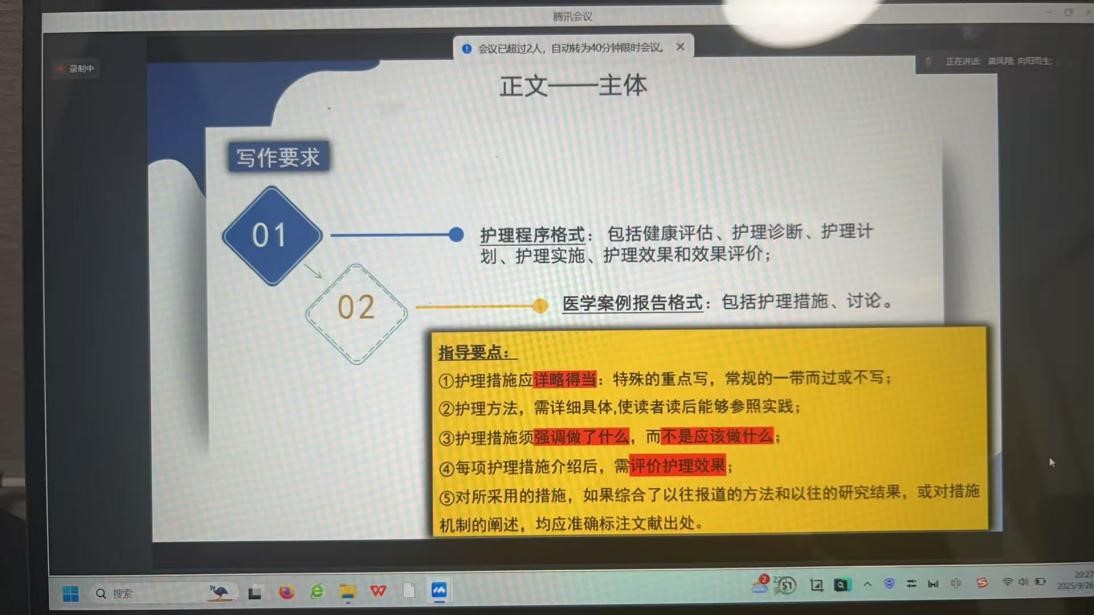 此次专项培训会由《护理研究》课程资深教师龚凤翔担任主讲,她从护理学专业毕业论文类型、选题立意、文献检索、研究设计到论文撰写、学术规范、质量标准进行详细的讲解,并对往年论文中存在的共性问题(如研究方法不规范、数据统计错误、讨论部分缺乏深度等)逐一剖析,提出了针对性改进建议。