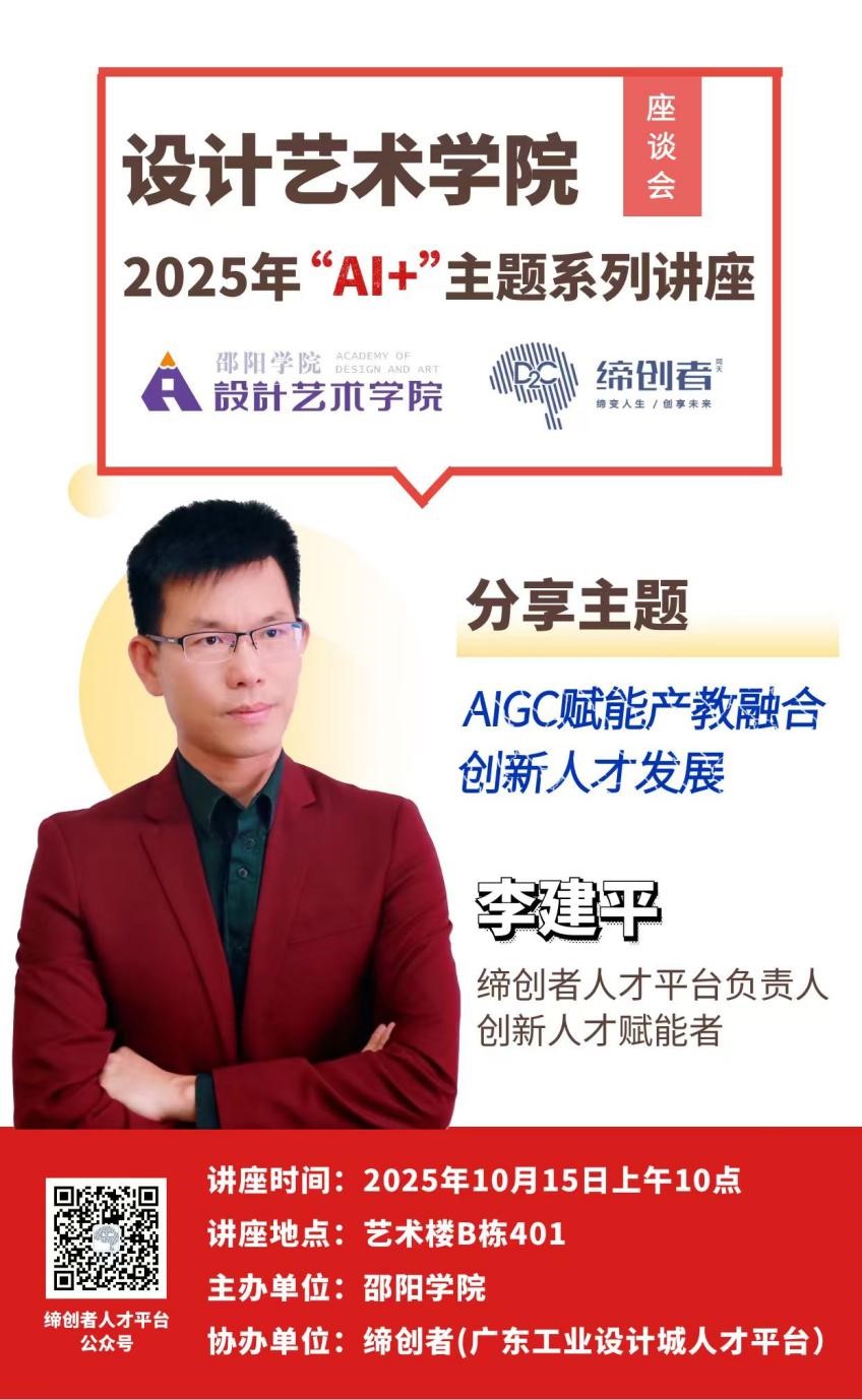 1015日上午10时,设计艺术学院2025年“AI+”主题系列讲座第三场在艺术楼B401教室顺利举办。本次讲座以“AIGC赋能产教融合、创新人才发展”为主题,特邀缔创者人才平台负责人、创新人才赋能专家李建平担任主讲嘉宾。