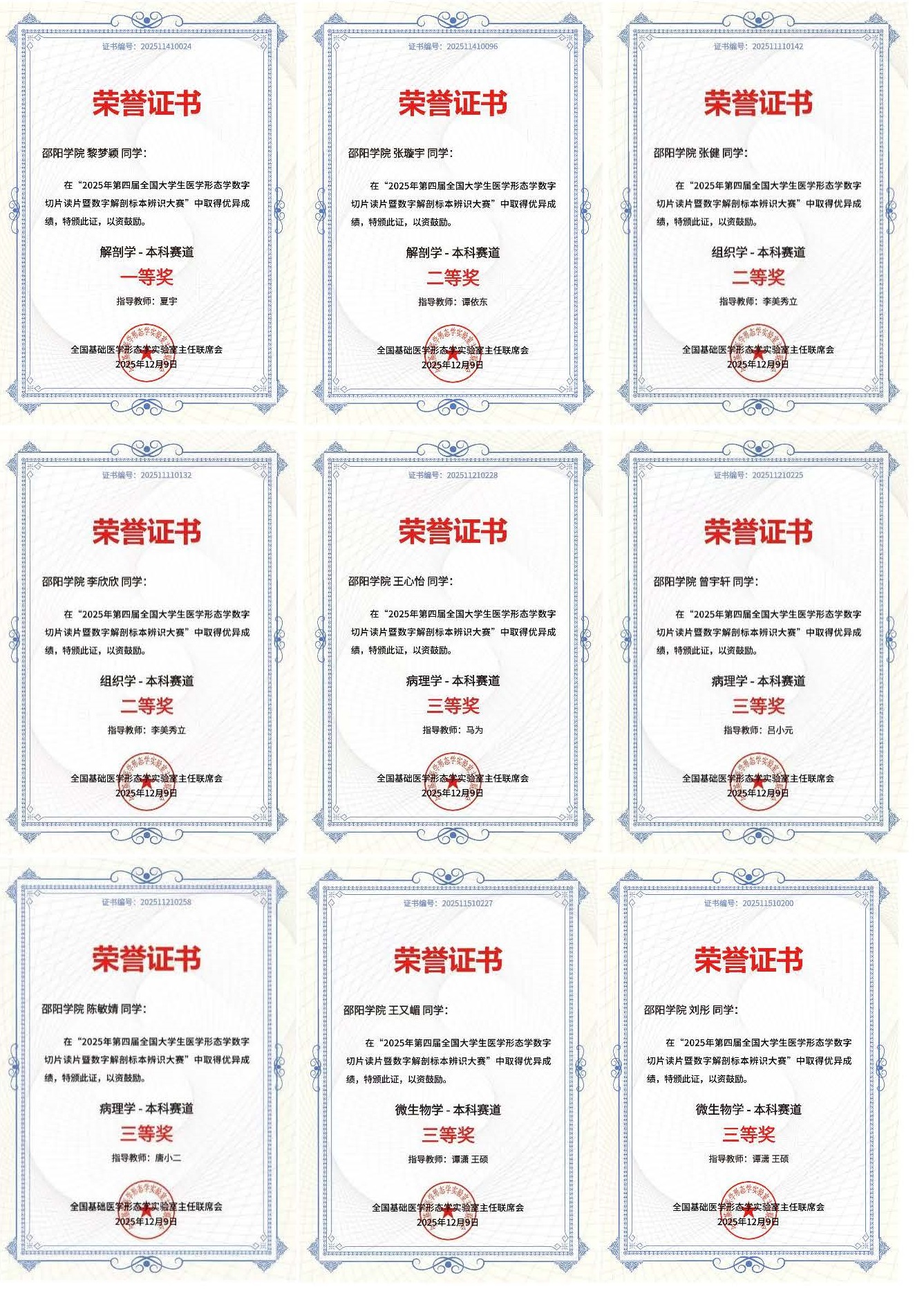 近日,第四届高等医学院校大学生数字形态学读片和数字解剖标本辨识技能大赛全国决赛圆满落幕。在本届大赛中,全国共有220余所院校近1.7万名学生同台竞技。我校参赛学子凭借扎实的专业功底、出色的实践能力与稳定的临场发挥脱颖而出,一举斩获一等奖 1 项、二等奖 3 项、三等奖 5 项,学校荣获 “优秀组织奖”。其中,普爱医学院临床医学专业学生黎梦颖(指导教师:夏宇)在竞争激烈的人体解剖学赛道表现优异,成功入围全国线下总决赛(全国本科组仅25人),充分展现了我校医学人才培养的扎实成效与过硬质量。