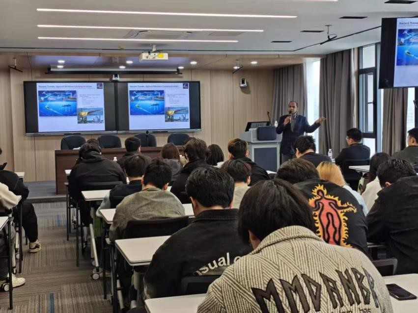 Khan博士围绕光子学基础、互联网浪潮下的信息与通信、通信系统架构、光纤通信技术及个人前沿研究成果展开分享,为在场师生勾勒出光通信技术赋能未来网络的广阔图景,引发热烈反响。互动提问环节,师生们结合专业学习与研究方向,纷纷就光通信技术落地难点、前沿研究方向等问题与Khan博士交流。
