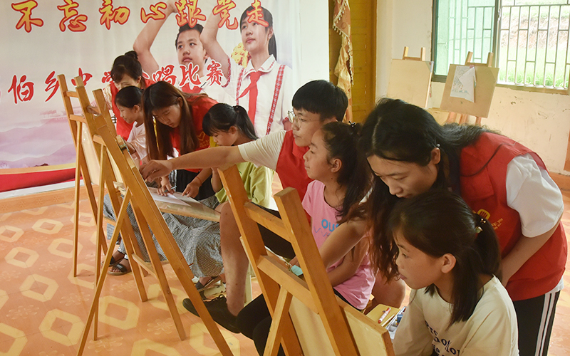 艺术设计学院组织成立了“非遗传承志愿服务团”,以“流动少年宫”的形式,在绥宁县、邵阳县的12个村镇开展教育扶贫