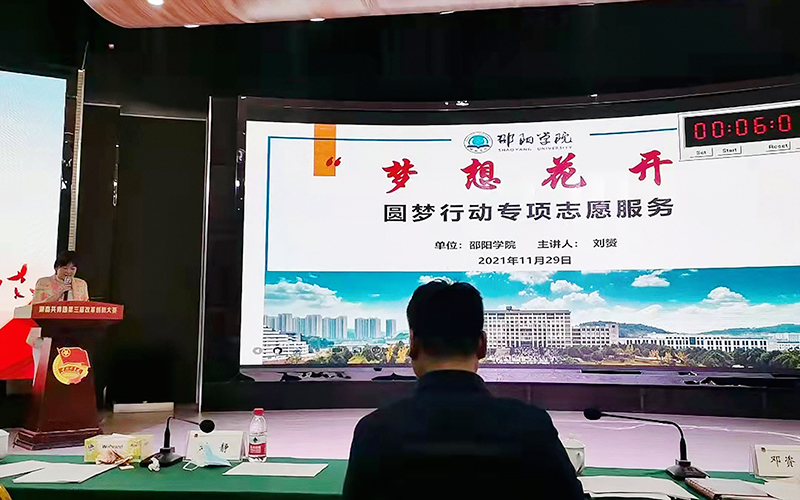 在湖南共青团第三届改革创新大赛上,我校团委书记刘赟讲述了梦想花开自2013年至2021年来帮助许多乡村孩童的感人故事,讲述志愿者们带去欢乐的课堂,讲述“梦想花开”的不断成长壮大以及“梦想花开”的“青苗计划”特色创新。答辩会的最后,志愿者代表进行《国家》的手舞操使得答辩会整体效果达到高潮,获得了评委与观众雷鸣般的掌声。