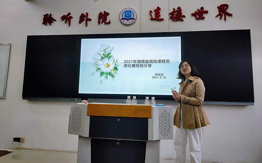 第二场讲座由湖南工业大学外国语学院刘毓容副教授主讲。刘毓容副教授曾获得2019年湖南省外语课程思政教学大赛特等奖,她向在座教师分享了近年参加课程思政比赛、教师课堂教学大赛、微课比赛的经验。刘毓容副教授从“课程思政是什么”,到参赛文本该如何设计,深入浅出、毫无保留地分享了自身的参赛经验。在分享过程中,刘毓容教授强调课程思政设计应当聚焦学生痛点,体现教学理念,如何解决问题,学生有何收获,教师如何反思、挖掘提升空间,梳理出主要创新点。在设计细节上,她特别提醒各位参赛教师注重比赛细节,规范书写格式、重视课程片段视频录制、防范个人信息隐形泄露等问题,对相关案例做了细致剖析,并为大家梳理了教学流程闭环图。参会教师们对此热烈回应,纷纷提问,气氛十分活跃。