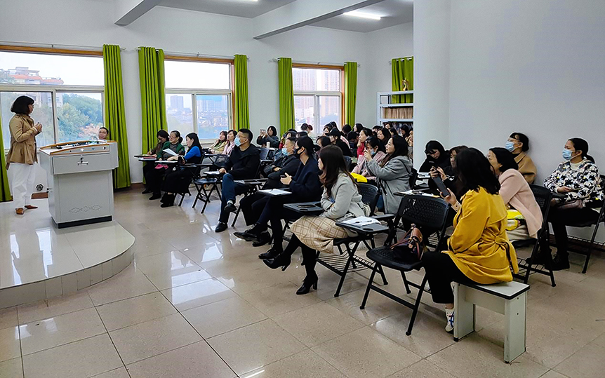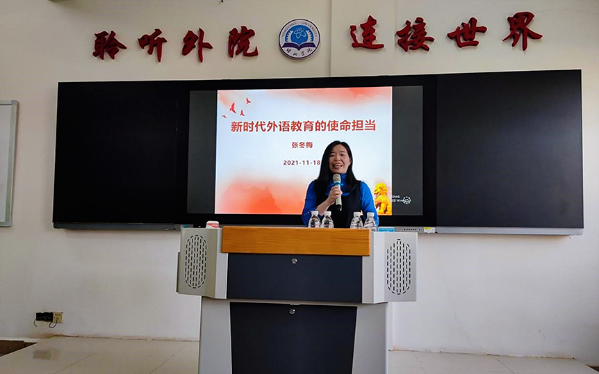 第一场由张冬梅教授主讲。作为邵阳学院的优秀校友,张冬梅教授首先深情回顾了在外语系的青葱岁月,并阐述了阅读与图书馆对自身成长过程中的深刻影响。尔后,张教授结合海外访学期间的所见所闻,以“新时代外语教育的使命担当”为题,围绕“Translating China”这一关键词,向与会教师分享了新时代下如何深化中外交流,讲好中国故事。