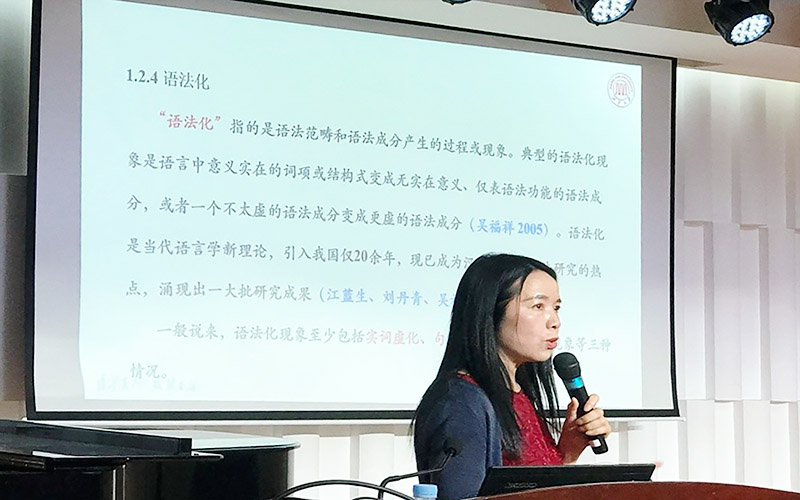 陈山青教授作了题为《湘语中的持续体标记及其语法化来源》的报告。陈山青教授从共时的角度列举了湘语8个持续体标记的用法,概括成两大类,并分析了各个体标记的来源,展示了其语法化的两种路径。报告还引用了方言中的儿歌、故事等例子。陈山青教授娓娓道来,讲述生动,亲切幽默,妙趣横生。
