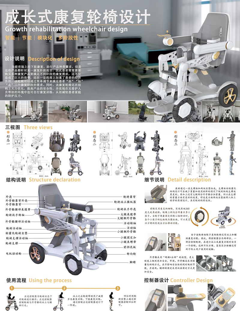 由胡玉平和张高德老师指导的艺术设计学院产品设计专业同学李裕、廖翰翾、高歌完成的作品“成长式康复轮椅设计”获得本次大赛的一等奖。评委们认为,当前市场上的下肢康复、助行产品种类繁多,但是这些产品都针对某一康复阶段而言,因此患者常常需要购买多种康复产品来满足不同阶段的康复需求,这不仅造成了巨大的浪费,还在一定程度上加重了患者的经济负担。该轮椅可以通过简单调节来满足患者“坐”“站”“走”三个康复阶段的需求。同时,该康复轮椅还在结构上大力优化,提高产品的安全性,并实现在无看护人员帮助的环境中也可自行康复训练,从而减轻患者家庭的陪护压力。