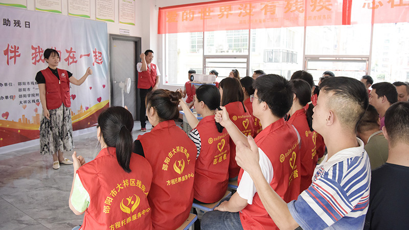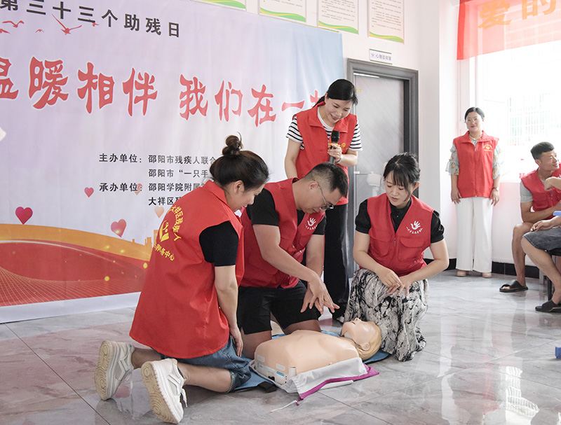 活动现场,邵阳学院附属第二医院手语志愿者与“一只手”志愿服务团队手语老师共同合作,为残障人士和工作人员开展了海姆立克急救法、鼻出血和关节扭伤的现场处理、心肺复苏术的双语(口语和手语)急救知识讲座,并带领大家进行实操练习。