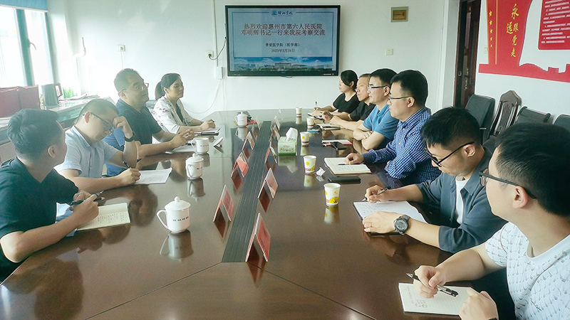 5月25日,惠州市第六人民医院党委书记邓明辉一行来我院交流调研。普爱医学院(医学部)院长贺志明、党总支书记黄俊、副院长佘贵平、护理学院副院长曹妍群等参加座谈会。会议由黄俊主持。
