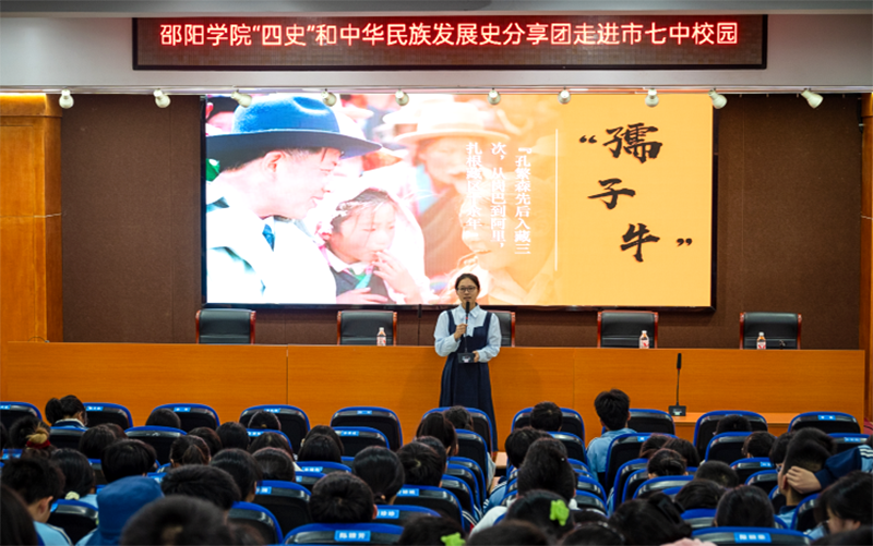 为深入贯彻落实习近平总书记关于“四史”学习教育的重要指示精神,使广大青少年深入了解党史、新中国史、改革开放史、社会主义发展史和中华民族发展史,10月28日,我校“四史”和中华民族发展史八个分享团队走进市七中开展宣讲。活动由市七中团委副书记杨益兵主持,市七中全体团员到场学习。