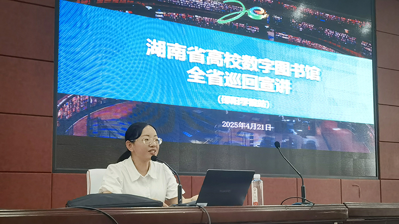为深化高校图书馆资源共享与服务交流,推动高校数字图书馆建设高质量发展,4月21日,湖南省高校数字图书馆(高数图)宣讲团一行5人莅临我校开展调研和宣讲工作。
