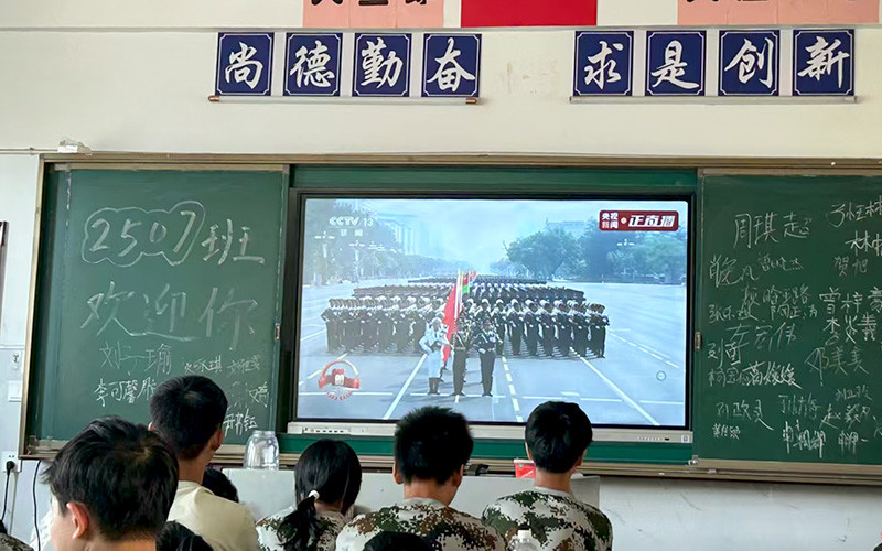 活动当天,志愿者通过“线上+线下”的方式与孩子们相聚。线上,依托云端平台,志愿者与偏远地区的孩子们一同观看九三阅兵仪式。当解放军迈着铿锵步伐走过天安门广场,战旗猎猎、军容严整的画面映入眼帘,孩子们目光紧锁屏幕,不时发出轻声赞叹,稚嫩的脸上满是庄重与自豪。线下,参与返家乡社会实践的志愿者组织当地学生围坐观看,没有了屏幕的阻隔,孩子们的情感更加真切,受阅装备列阵而过时,他们自发鼓掌,小小的手掌拍得通红。