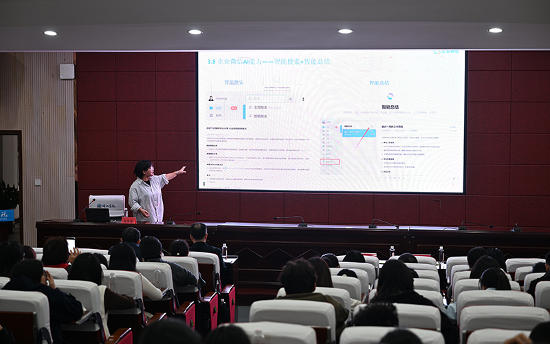 首先,赵敏丽讲话。她指出,信息化的工作、信息化的学习是我们必须面对和应对的重要任务。近年来,学校在信息化建设上持续发力,已构建起一定的数字校园基础。随着移动互联网的普及应用,企业微信已成为众多高校首选的移动端解决方案。我校在企业微信的应用方面已初见成效,但其推广与拓展仍需投入更多努力。她对培训人员提出三点希望:第一,希望各位信息员主动担当起信息化推广的职责,既要率先学好、用好平台系统和企业微信,提升自身信息化能力,还要积极推动本单位信息化水平的提升;第二,希望学生干部争当信息化使用先行者,先学一步、学深一层,熟练掌握信息化技术和企业微信,并引导同学们高效获取校园资讯、参与教学互动,让大学学习和生活更便捷高效;第三,希望师生参与到数字化素养提升当中去,通过参加各类数字化培训、线上资源学习及实践操作等活动,掌握企业微信等数字化工具使用技能技巧,提高效率。