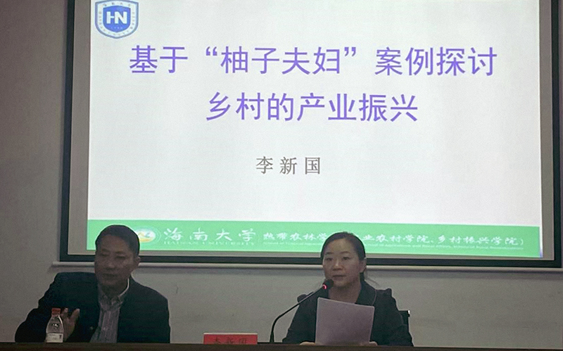 讲座中,李新国以海南知名农业品牌“柚子夫妇”为案例,从品种改良、标准化种植、品牌营销和产业链延伸四个维度,系统剖析乡村特色产业振兴的实践路径。他介绍,科研团队通过选育优质柚子品种、优化水肥管理与病虫害防控技术,显著提升果实品质;继而以品牌化运营打通高端市场,延伸开发果脯、精油等加工产品,构建起“种植—加工—销售”一体化产业链。他强调:“特色农产品要实现价值跃升,必须走‘品种+技术+市场’三位一体的发展道路,科研成果转化与市场化运作是带动农民增收的关键。”