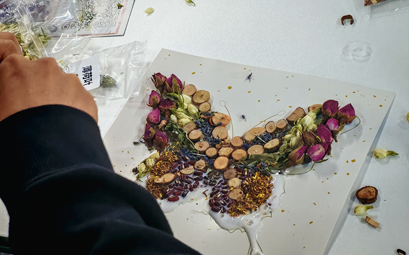 实操环节中,黄慧分步演示非遗中药画制作流程:构思画稿、分区上胶、拼贴药材、风干定型、装裱展示。参与者运用枸杞、金银花、决明子等药材创作山水、花鸟主题作品。创作过程中,学生专注操作,通过慢节奏手工活动缓解压力,实现身心放松。现场共完成中药画作品80余幅,兼具文化内涵与艺术价值。