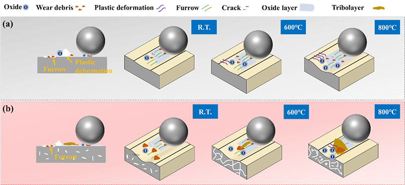 研究发现,该涂层表现出独特的高温耐磨特性。在室温至800℃的测试中,涂层的磨损率随温度升高反而显著降低。通过微观结构分析,团队揭示了其优异性能的机理:涂层中的析出相构成了独特的骨架结构,显著提高了涂层在高温环境下的强韧性。此外,高温摩擦后的涂层表面形成了致密的复合氧化膜。这层氧化膜既能起到固体润滑作用,降低摩擦系数,又能有效隔离摩擦副的直接接触,从而大幅提升涂层的耐磨性。