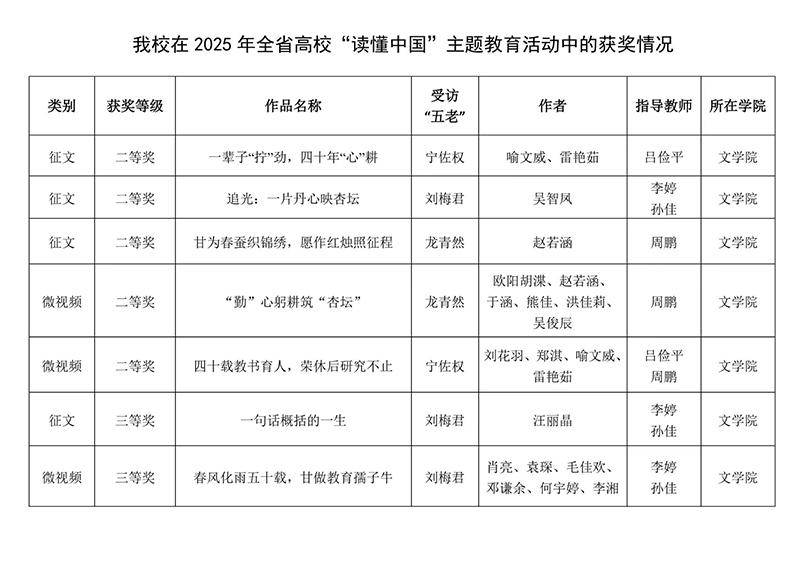 近日,湖南省委教育工委公布了2025年全省普通高校“读懂中国”主题教育活动评选结果。我校关工委报送的7项作品全部获奖,其中二等奖5项,三等奖2项(名单附后)。