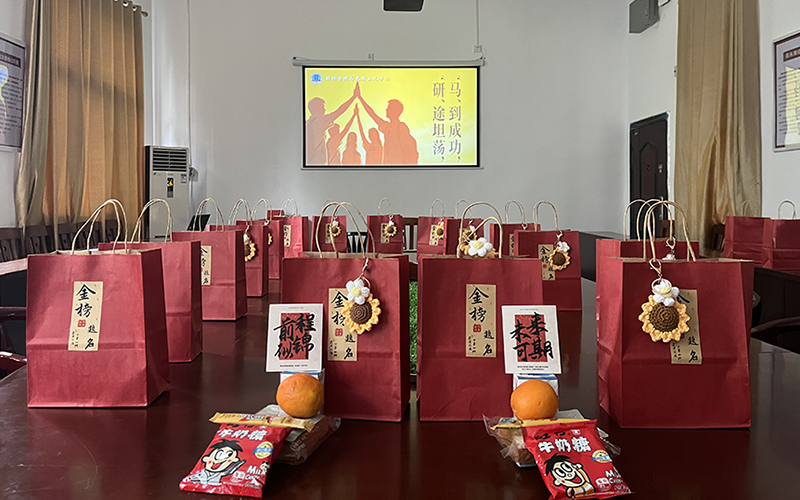 本次活动由学院党总支书记易佑斌、党总支副书记朱瑾以及学院辅导员共同参与,为考研学子发放“考研加油包”。加油包内既有实用备考用品,也有舒缓压力的暖心零食,更附有写满真诚祝福的鼓励卡片,旨在从物质与精神两方面给予同学们支持。一份份礼物,一句句问候,传递出学院对考研学生的深切关爱与殷切期盼。