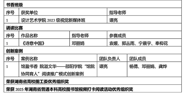 2025年,我校以“阅读见世界,学习铸宏图”为主题,开展了41个阅读推广活动,在湖南省普通高校“一校一书——经典、精读、经世”阅读推广活动评选中,取得较好的成绩,荣获17项省级奖项,其中湖南省教育厅的书香班级一等奖2个,二等奖1个;创新案例1个;优秀读书报告一等奖1个,二等奖2个,三等奖4个;诵读比赛三等奖1个。湖南省图工委评的优秀组织奖、书香班级奖、创新案例奖、诵读比赛奖各1个。同时,我校图书馆还荣获2025年湖南省普通本科高校图书馆视频打卡阅读活动优秀组织奖(具体获奖名单见附件)。