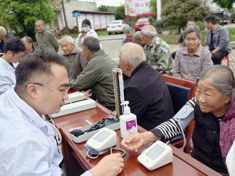 活动现场,师生志愿者在村服务中心广场搭建一站式健康服务平台。在基础健康筛查环节,学生志愿者在教师党员指导下为村民测量血压、血糖,记录数据并作对比解读,针对数值异常的老人提供个性化饮食与用药建议。在一对一健康咨询环节,师生结合专业知识,耐心解答高血压、糖尿病、关节炎等慢性病管理问题,纠正常见用药误区,讲解科学作息与居家护理技巧。护理学院红十字协会还开展了急救技能科普,集中讲解心肺复苏、海姆立克急救法动作要领,并通过模拟人实操演示,帮助村民和村委会工作人员掌握急救技能。