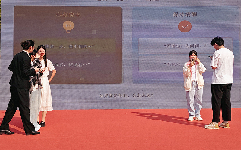 室内宣讲结束后,户外法治宣传活动在李子园校区足球场同步开展。活动设置四个区域:知识宣讲互动区设立宣传咨询台,工作人员向同学们发放宣传手册,结合案例细致讲解国门安全与反走私知识,剖析违禁品、非法电子烟的危害,引导大家树立“守护国门、拒绝走私”的意识。有奖竞答区设置互动答题墙,同学们围绕出入境监管、生物安全等内容认真作答,工作人员现场答疑并发放纪念品,以趣味问答形式巩固所学知识。创意游戏区开展“国门卫士套圈大作战”,参与者通过投掷套圈识别违禁品与外来物种,在轻松互动中强化守护国门的责任意识。法治小剧场邀请学生实景演绎违规携带、走私等典型案例,通过沉浸式角色扮演让同学们直观感受违法后果,深刻领会守法的重要性。