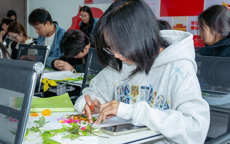 与此同时,农林生态学院“一站式”学生社区内,“拾花压花,定格美好”活动正暖意融融地进行。主持人尹业洋从古代文人夹花赋诗的雅趣,讲到现代压花技艺的生活应用,袁平平、何丽霞、倪绯三位老师则结合专业优势,现场示范书本压制法——花材平铺、吸水纸铺设、重物压制,每个细节都透着对自然的珍视。同学们手持提前备好的花材,在老师指导下有条不紊地展开创作:有的以简约构图展现自然本真,有的融入创意设计搭配文字寄语,还有的结合农林专业特色,用不同植物的花叶勾勒生态画卷。当一件件作品在手中成型,捧着自己亲手制作的压花作品合影时,同学们脸上的成就感与幸福感,定格成了这个春日最美的画面。