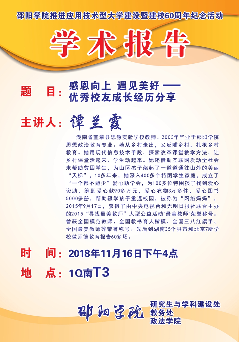 邵阳学院推进应用技术型大学建设暨建校60周年纪念活动学术报告《感恩向上 遇见美好—优秀校友成长经历分享》