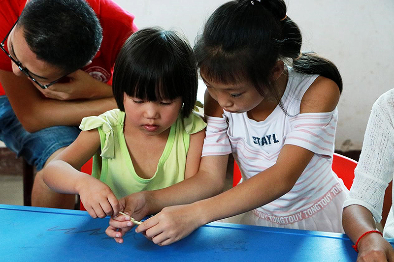 8月28日,志愿者们一路欢声笑语来到了儿童快乐家园,开启了三下乡的首次支教活动。这次志愿者给小孩子带来的是一堂科学实验课,志愿者陈述:为了给孩子们上一堂精彩的实验课,志愿者们在前一天晚上已经提前将所有实验都做过一遍。所以课堂实验效果明显。而在略微有些嘈杂的课堂上,记者发现有一位小女孩,坐姿格外的端正,回答问题也相当的积极。课后另一个志愿者问到这位女孩,小女孩说:“那个志愿者姐姐上次来时教过一个类似的实验,所以这次老师提的问题我都知道”说完便立刻跑到了志愿者的身边。和志愿者亲密的玩耍。
