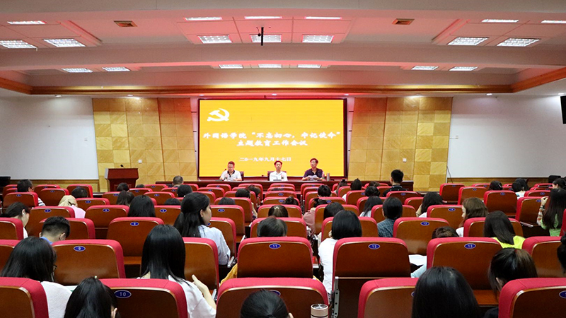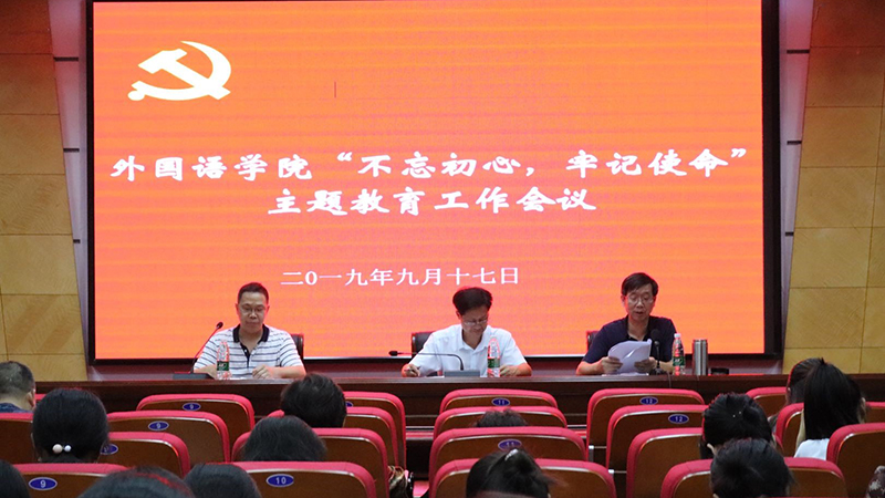 为深入贯彻落实中央、省委 以及校党委“不忘初心、牢记使命”主题教育工作会议精神,9月17日晚,外国语学院在李子园二楼报告厅召开“不忘初心、牢记使命”主题教育工作会议,校党委委员、宣传统战部部长王玉林同志亲临会议指导,外国语学院党政领导和全体党员出席会议,大会由党总支副书记、副院长(主持行政工作)成祖堰教授主持。