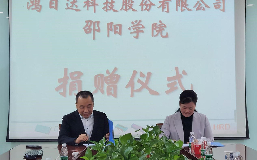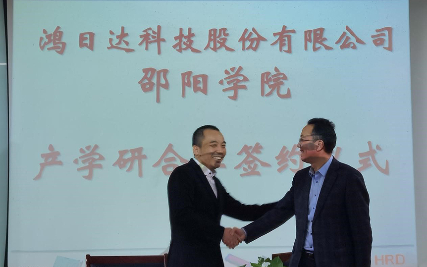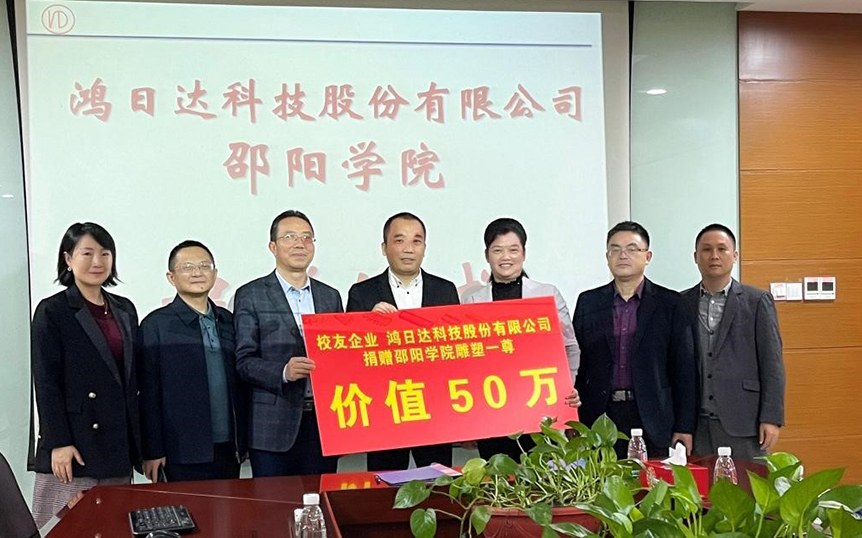 最后,举办了邵阳学院与鸿日达科技股份有限公司产学研合作暨捐赠签约仪式。鸿日达科技股份有限公司将在人才培养、产品研发、生产等领域加强与学校合作,王玉田校友以个人名义向学校捐建一尊价值50万元的雕塑,促进学校校园文化建设。