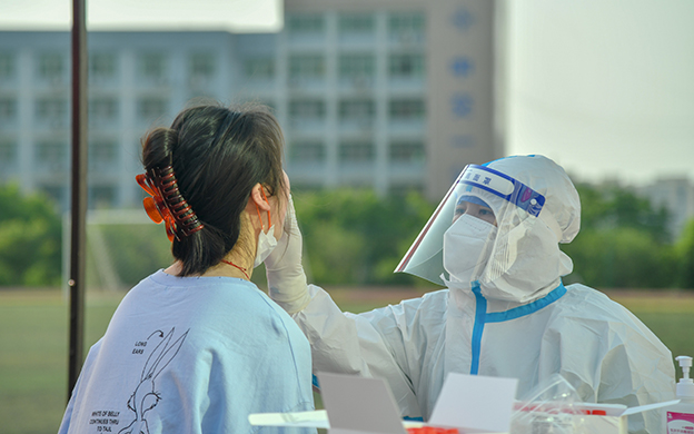 口罩、手套、防护服、眼罩、面屏,是这些队员们的标配。每采集一人都要消一下毒,她们用温柔的目光安抚每一位师生,提示每一位师生张开嘴巴。连续4至5个小时不间断采样,期间不喝水、不吃饭、不上卫生间,采集完后汗水浸透了他们的衣服,身体感觉被全部掏空,只想躺下来休息,对家里的担心已抛之于脑后。