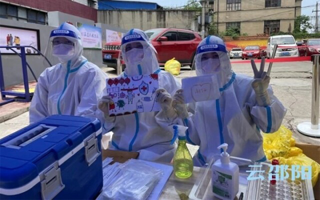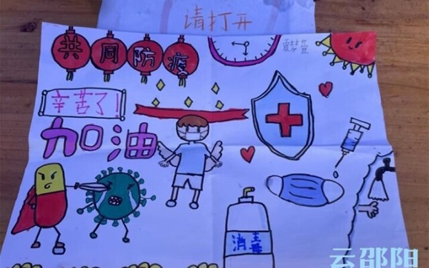 23日,附属第一医院的邓亮和队员们在邵水桥社区轻纺市场(魏源市场)采集核酸标本时,发生了暖心的一幕,一位名叫夏梦萱的小朋友在排队准备核酸检测时,将自己画的“大白”送给了工作人员。
