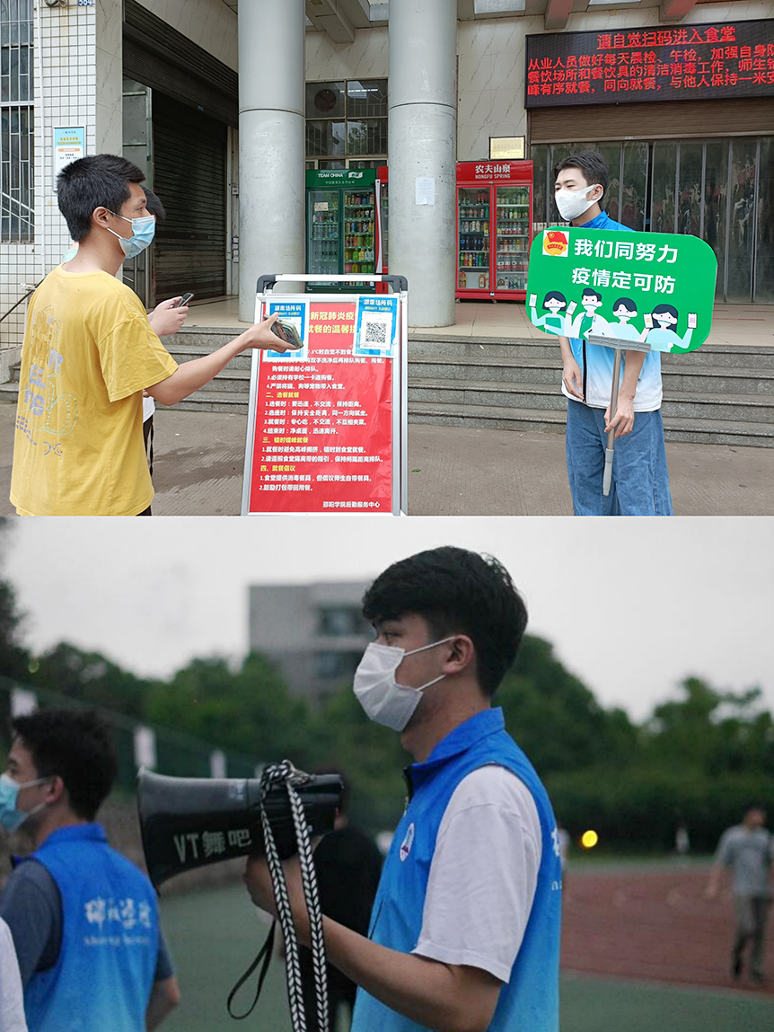 中午和下午就餐时间段,志愿者会在各食堂门口手持防疫主题标语牌执勤站岗,查看师生场所码和健康码,检测体温,对未戴口罩的人员进行劝导。晚上,志愿者也会在校园内开展巡逻,提醒师生佩戴口罩,保持安全距离,并对聚集现象进行劝阻。“请佩戴好口罩!”“请大家保持一米线!”“请大家健强体魄,保持好心情!”一声声劝导、一句句问候,只为帮助大家守护好健康绿码,用实际行动为我校打赢这次疫情“阻击战”贡献青春力量。