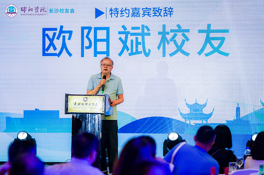 在年会盛典上,长沙校友会(第四届)会长曾铁林致欢迎词,长沙校友会监事会主席刘干良作财务报告。随后,大会特邀嘉宾、77级中文专业校友、湖南省政协原副主席欧阳斌讲话,他表示,自己作为邵阳学院的校友,是带着感恩、祝福和对新时代无限憧憬和梦想而来,希望为母校、为校友、为这个伟大的时代鞠躬尽瘁,贡献自己光和热。