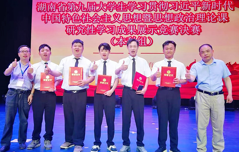 5月27日上午,湖南省第九届学习贯彻习近平新时代中国特色社会主义思想暨思想政治理论课研究性学习成果展示竞赛决赛在湖南第一师范学院举行。由2021级美术学4班肖涛、周锦豪、黎泽亚、杨子葵、张俊扬五位同学组成的研究性学习小组,在我校董竞副教授指导下,以作品《共同富裕视域下青年大学生助力乡村振兴的路径研究 》斩获本科组一等奖。