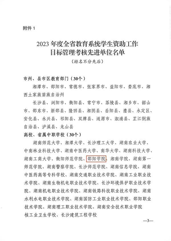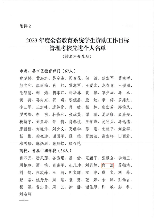 近日,由湖南省教育厅开展的2023年度全省教育系统学生资助工作目标管理考核结果揭晓,我校获评“先进单位”,学生资助中心向洁获评“先进个人”。
