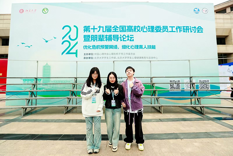 10月16日至18日,由中国心理学会心理危机干预工作委员会和全国高校心理委员研究协作组主办的第十九届全国高校心理委员工作研讨会暨朋辈辅导论坛在北京大学隆重举行。我校大学生心理健康教育中心汪瑶老师带领李子彤、张晋源两位优秀朋辈心理干部参加本次大会。