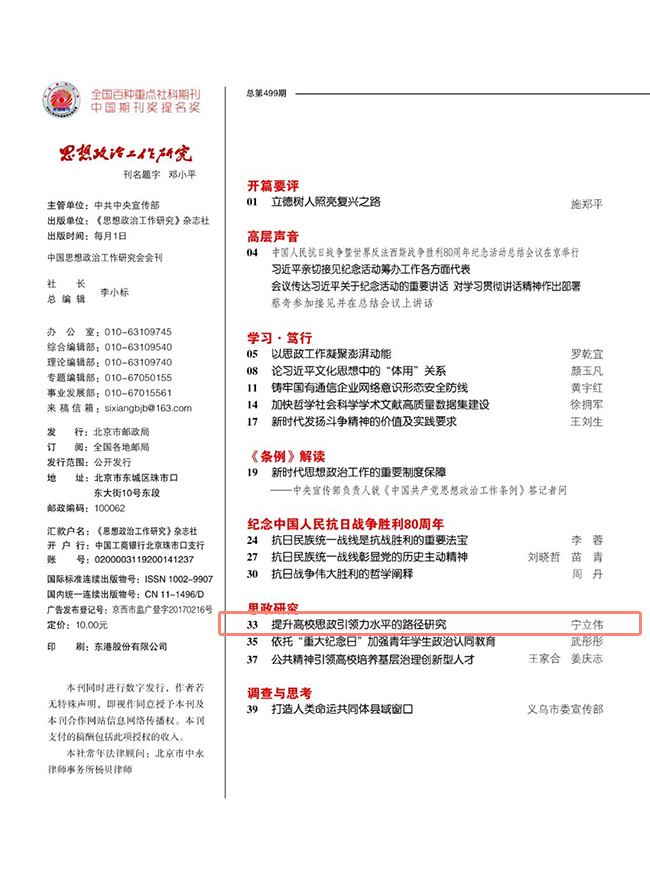 近日,校党委书记宁立伟在《思想政治工作研究》(2025年10月刊)发表题为《提高高校思政引领力水平的路径研究》的理论文章,系统阐述新时代高校思政教育创新发展的实践路径。
