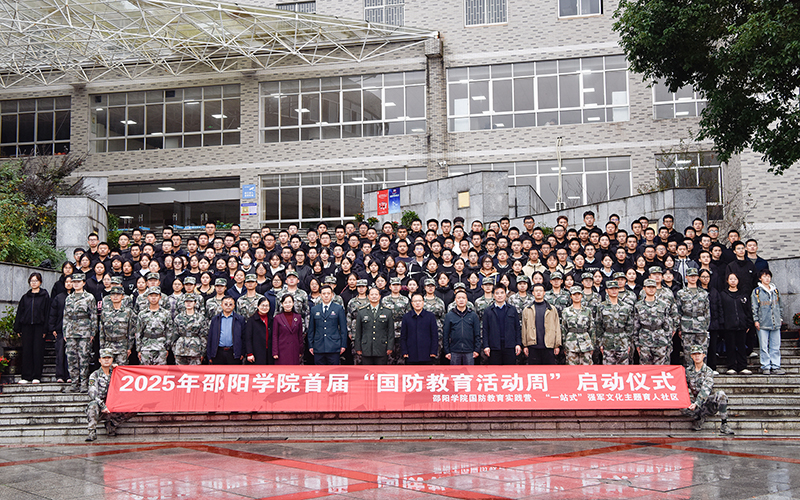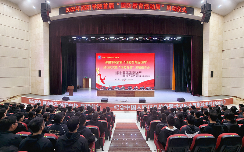 1110日上午,邵阳学院首届“国防教育活动周”启动仪式在七里坪校区逸夫图书信息楼报告厅举行。活动以“魏源故里思安危·雪峰山下系国防”为主题,原国防科技大学董晓军教授、校党委委员、副校长黄秋生、邵阳市大祥区人民武装部处级副职副部长孙科文、校党委宣传部常务副部长唐跃、学生工作部(武装部)部长蒋德意、副部长周廷建、李艳月、宋传颖及800余名学生出席本次启动仪式。本次启动仪式由蒋德意主持。