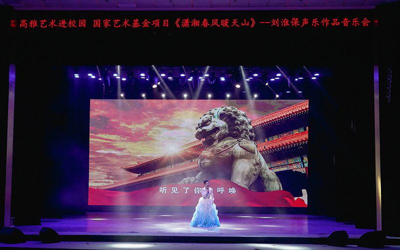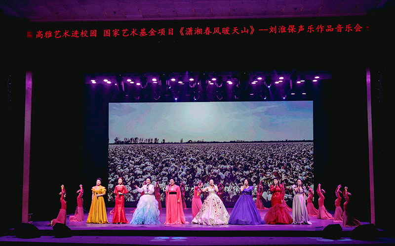 弦歌不辍育新苗,艺韵悠长润校园。11月27日晚7时30分,怀化学院音乐舞蹈学院艺术教学实践基地(西区大礼堂)灯火璀璨、座无虚席,湖南省高雅艺术进校园活动 —— 国家艺术基金资助项目《潇湘春风暖天山》刘淮保作品音乐会在此隆重上演。怀化学院党委书记王刚,邵阳学院党委书记宁立伟,怀化学院党委委员、副校长周小李、刘建国,两校相关职能部门领导、师生代表及 2025 年湖南省 “青马工程” 高校班全体学员齐聚一堂,共同沉浸在这场融思想性与艺术性于一体的视听盛宴中。