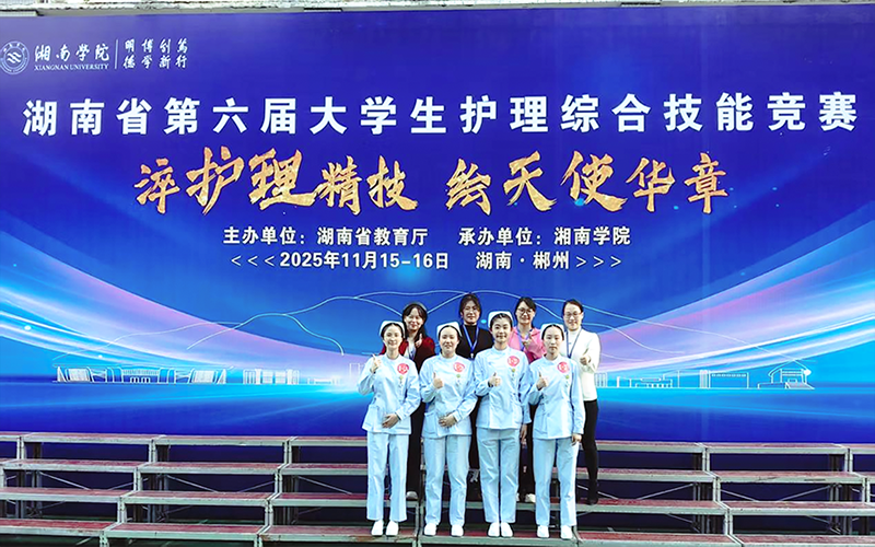 在近日结束的第六届湖南省大学生护理综合技能竞赛中,我校护理学院代表队荣获团体三等奖,该院学生贺玉婷、涂佳佳、吴梦盈分获个人单项一、二、三等奖,龚凤翔老师获评“优秀指导老师”。