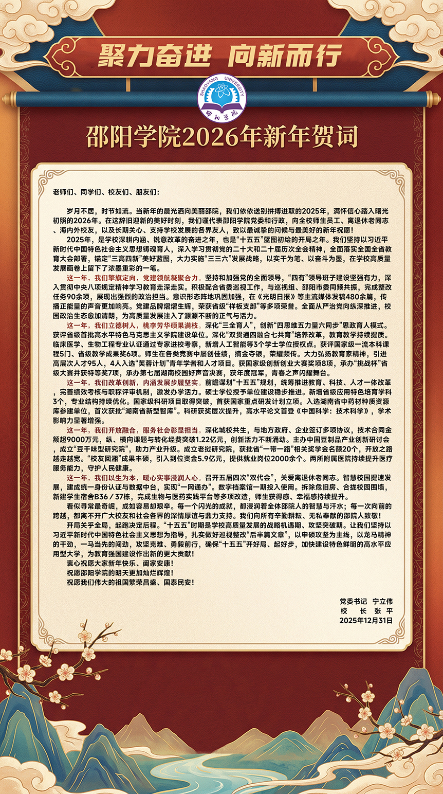 岁月不居,时节如流。当新年的晨光洒向美丽邵院,我们依依送别拼搏进取的2025年,满怀信心踏入曙光初照的2026年。在这辞旧迎新的美好时刻,我们谨代表邵阳学院党委和行政,向全校师生员工、离退休老同志、海内外校友,以及长期关心、支持学校发展的各界友人,致以最诚挚的问候与最美好的新年祝愿!
