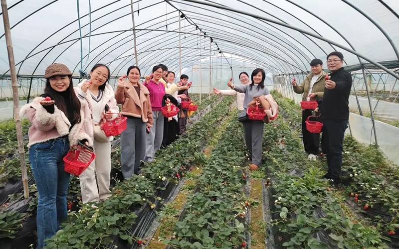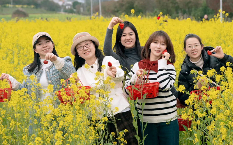 春日桃林繁花缀枝,女教职工们结伴漫步其间,抬手轻触花枝,定格与春光相拥的瞬间;连片的油菜花海中,大家或挽手同行,或舒展身姿,在明媚春光里绽放笑容;现代化草莓大棚内,大家提着果篮穿梭田垄,亲手采摘饱满果实,沉浸式体验田园收获的乐趣。此外,各分工会还组织了户外趣味团建,创意合影、互动游戏等环节拉近了彼此距离,现场氛围轻松融洽。