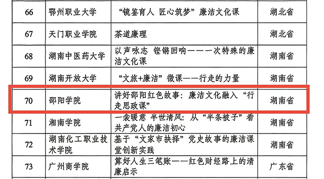 近日,教育部办公厅正式公布第十届高校廉洁教育系列活动评选结果,我校马克思主义学院打造的《讲好邵阳红色故事:廉洁文化融入“行走思政课”》作品,成功入选本届活动“树廉风”廉洁文化课优秀作品,这是我校在廉洁文化建设与思政教育融合工作中取得的重要突破性成果。