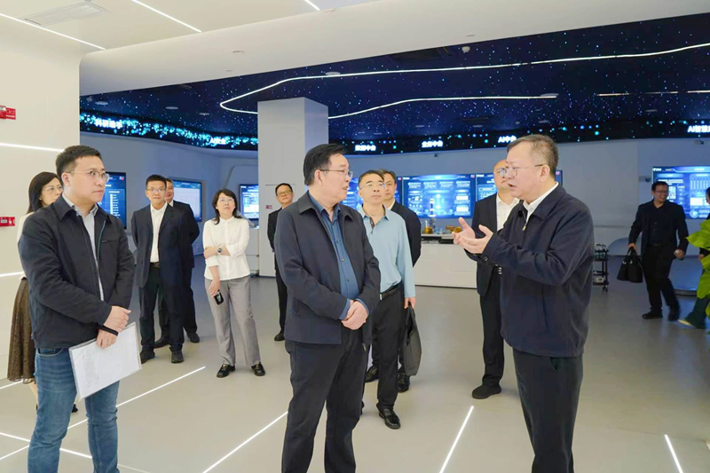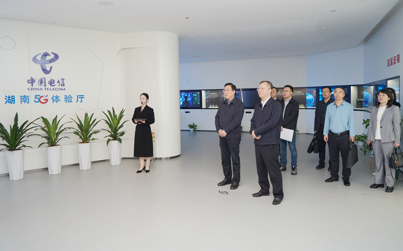 宁立伟一行首先参观了红色展厅与5G体验厅,随后进入中南智能算力中心考察。通过听取介绍和实地察看,全面了解湖南电信发展历程和在5G应用、“空天地”一体化网络、量子融云、人工智能、大数据、算力服务等前沿领域的创新成果与丰富的实践案例。